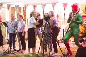 Inspired by a family friendly festival, and determined to make the most of an extended summer, the first Minifest was hosted in aid of JMB Educational Fund. Over 170 glitter-clad revellers enjoyed a fun afternoon of garden activities and entertainment; the highlight according to the kids ‘the assault course of course!’ This saw a fiercely competitive team challenge…from 5 to 50 year olds…no mercy shown. BBQ nosh, more delicious homemade bakes than you can imagine; all washed down with refreshments aplenty. For those seeking relaxation, there were sofas, cushions and a keyboard, perfect for chilling out & catching up with friends & family alike. The day even saw the unexpected reuniting of two uni friends after a 10 year hiatus. Wonderful performances on the ‘Main Stage’/’Under the awning!’ from Richie Carr (Acoustic guitarist), Rob Green (Singer & Musician) and 3 Minute Rockstar (Rock karaoke band); see if you can spot the Charity’s founder ‘rocking his stuff.’ As night fell and the campfire crackled for the hardcore campers, the silent disco came into it’s own. The event was an overriding success, raising £900 for the Charity. A huge thank you to all those who supported Minifest in whatever capacity: attending, donating, baking, helping, buying, singing and dancing…all appreciated. Will it be back? Watch this space!